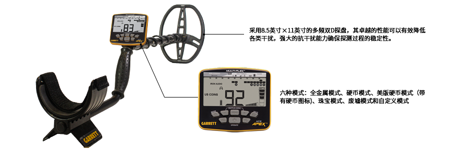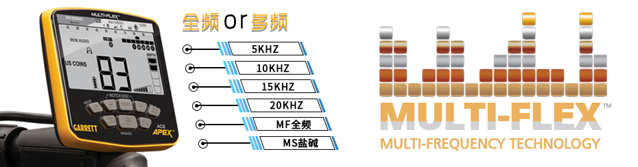 美國蓋瑞特品牌APEXpro金屬探測器采用多頻段多頻率技術(shù),以最先進的寬帶數(shù)字平臺為動力,為您提供全面的探測能力。您可以在6個頻率選項中任意選擇,并在各種Apex探測模式(如珠寶、廢墟、硬幣等)下操作。為了提高對特定類型目標的探測能力,您可以選擇將所有探測器的發(fā)射機功率集中到一個頻率點?;蛘?,您也可以選擇Apex的同步多頻模式之一,以實現(xiàn)對所有土壤中的所有目標的出色探測。